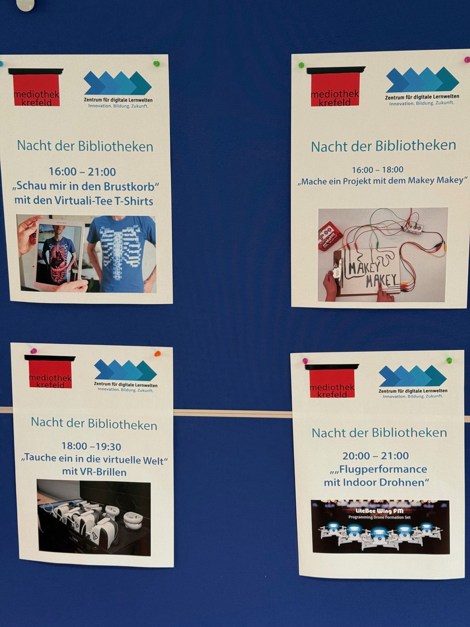 Am 04. April 2025 lud die Mediothek Krefeld zur landesweiten „Nacht der Bibliotheken“ von 16:00 – 21:00 Uhr ein. Mit dabei: das Zentrum für digitale Lernwelten (ZfdL) mit einem besonderen Programm, das verschiedene Möglichkeiten aus dem Bereich digitale Bildung präsentierte.